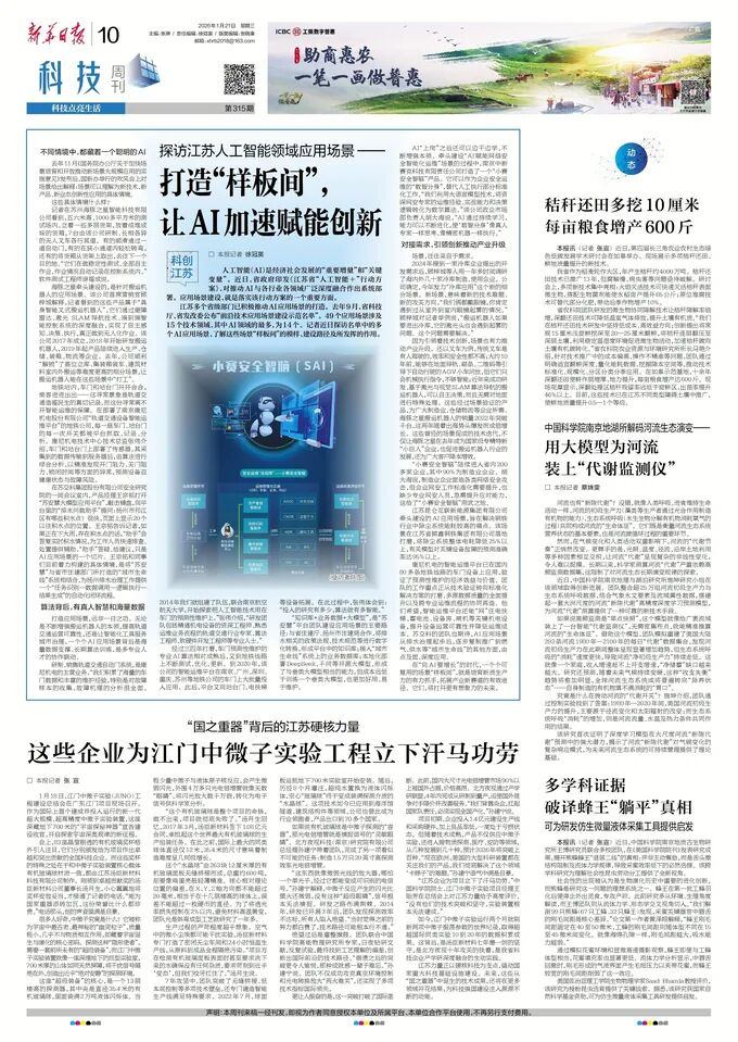 2026年1月21日,《新华日报》以《探访江苏人工智能领域应用场景——打造“样板间”, 让AI加速赋能创新》为题,报道了350vip浦京集团等入选江苏省“前沿技术应用场景建设示范名单”企业,在应用场景建设方面的实践与成效。