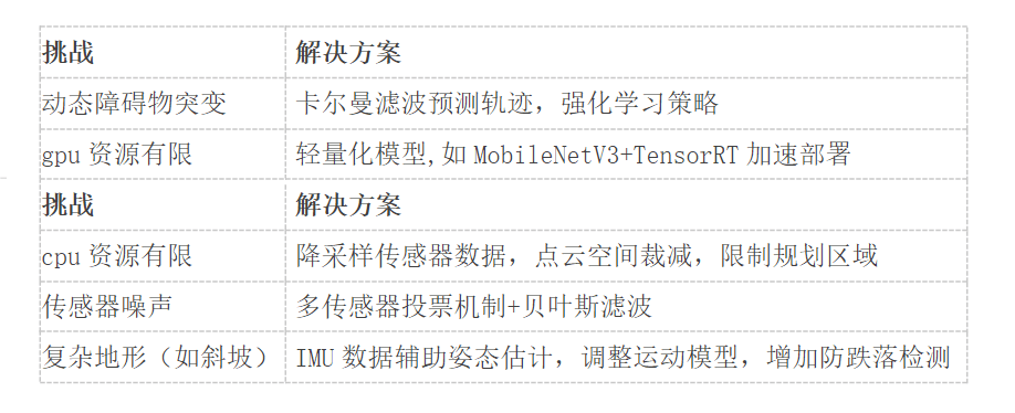 远近分工:3D雷达点云检测远端全局障碍,深度相机识别近端局部障碍。