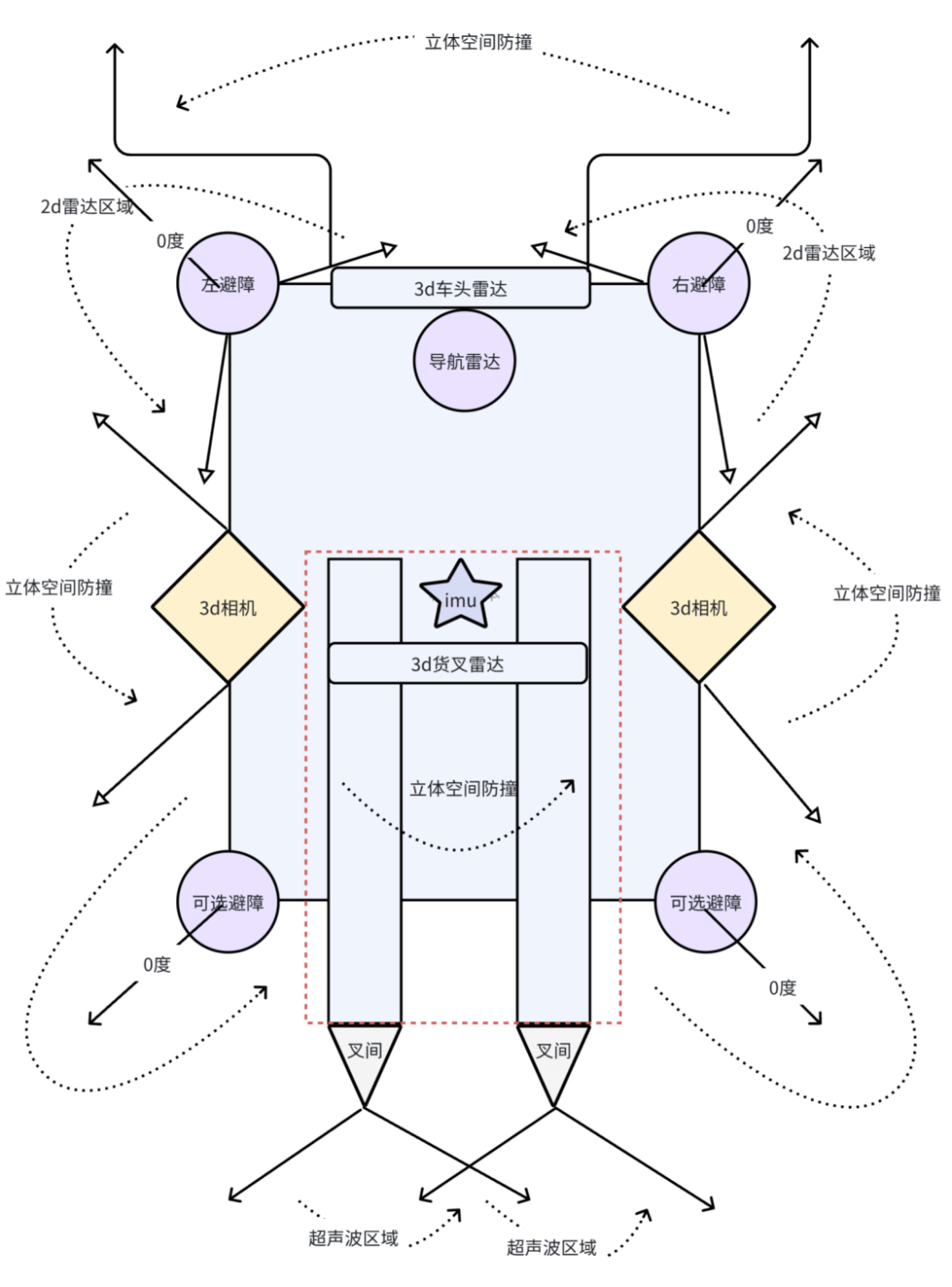 货叉防撞:货叉搭载IMU实时监测姿态,结合上下3D激光数据,动态预测货叉运动轨迹并防护周边区域。